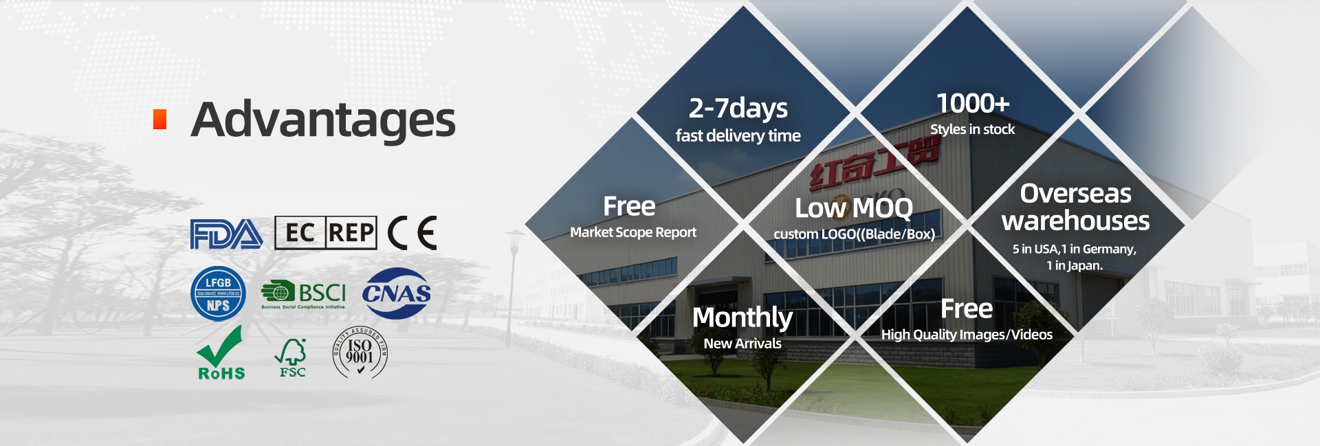 Productos principales:Cuchillos de cocina y tijeras, navajas de bolsillo, cuchillos de exterior, palas de exterior, utensilios de cocina de silicona